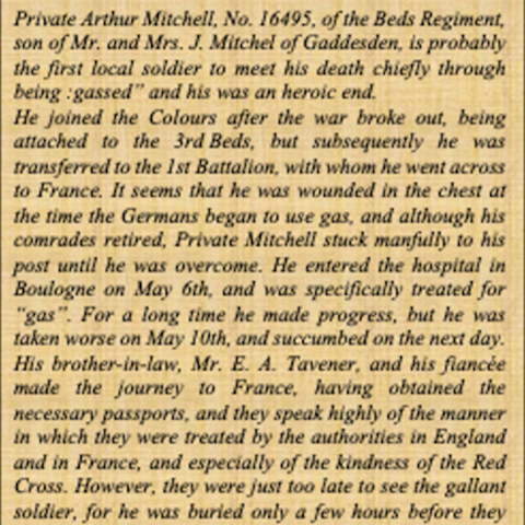 Arthur was possibly the first soldier from Hemel Hempstead to die chiefly as a result of German gas attacks. On the morning of the 5th May the battalion War Diary records an attack: "5 May 1915 At a little after 8 a.m. enemy attacked with asphyxiating gas laid on from two points opposite our trenches. Battn stuck to its trenches, though a few men killed by gas, & all were badly affected."