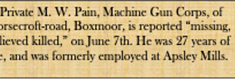 Anticipating the plan at Messines the Commander of the 5th Army, General Plumer, was alleged to have said to his staff: "Gentlemen, we may not make history tomorrow, but we shall certainly change the geography." The British Army suffered over 17,000 casualties in capturing the salient at Messines and Major William Pain was one of the men who was ‘Killed in Action’ during the first advance. Initially listed ‘Missing Presumed Killed’ it was later confirmed officially that Major had died on Thursday, 7th June 1917. A brief entry in the Hemel Gazette reported that he was missing a few weeks after the action at Messines.